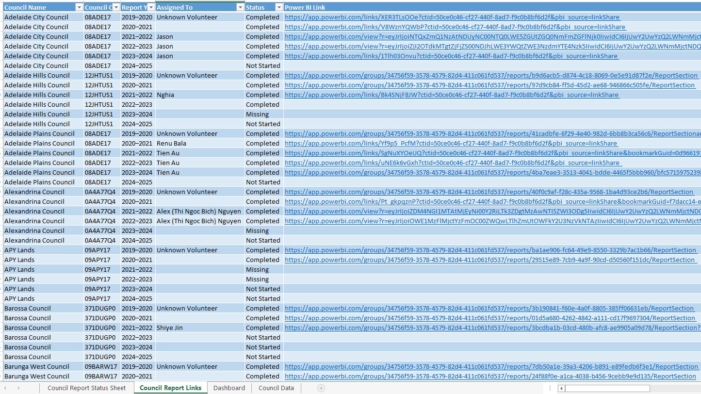 This tracker allows the team to instantly filter by council, year, or volunteer, and provides a clear overview of our progress.