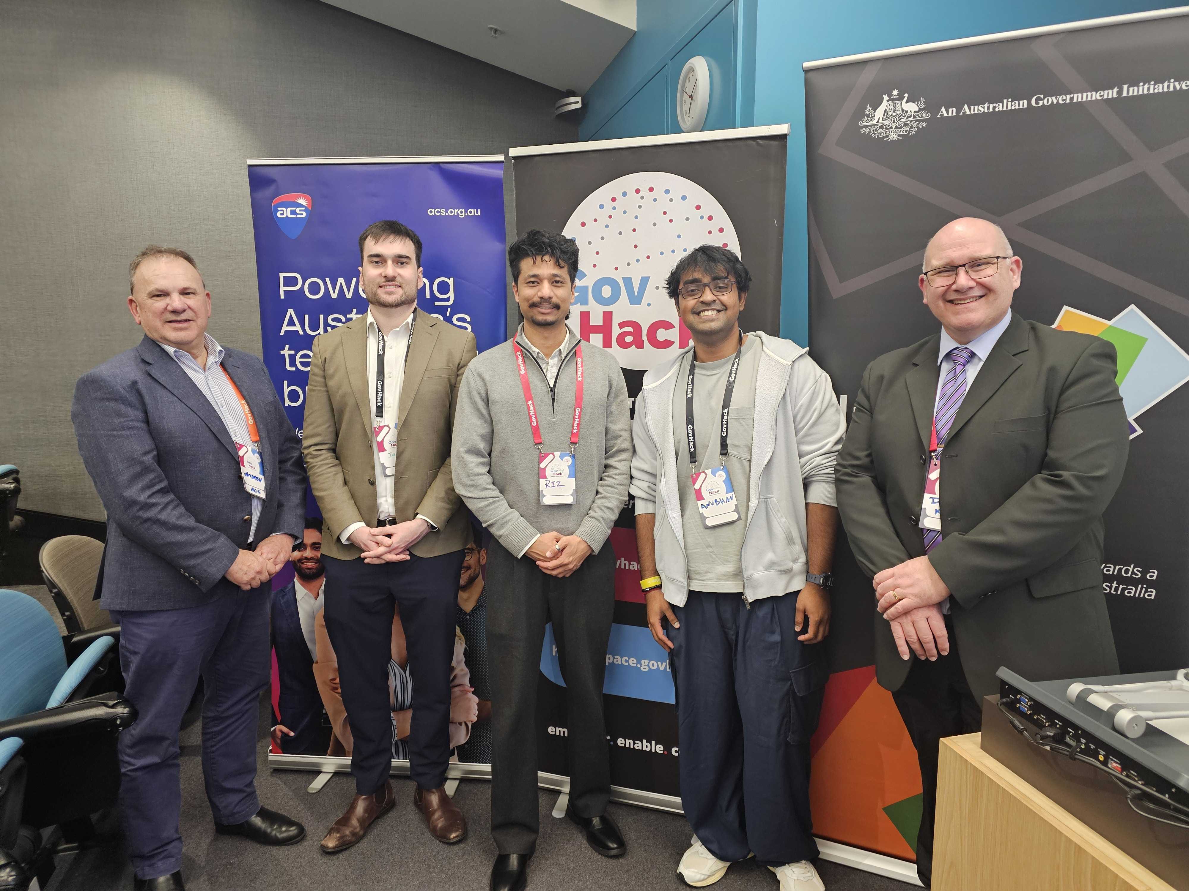 From Left to Right: Andrew Haste(ACS South Australia State Manager), Joseph O'Sullivan(ACS Member Services Coordinator), Rizan Shrestha( SA Regional Lead), Anubhav Dattagupta(Acting Data Analysis Team Lead) and Darrell Klar(Manager Scyne Advisory and Chief Orator GovHack)