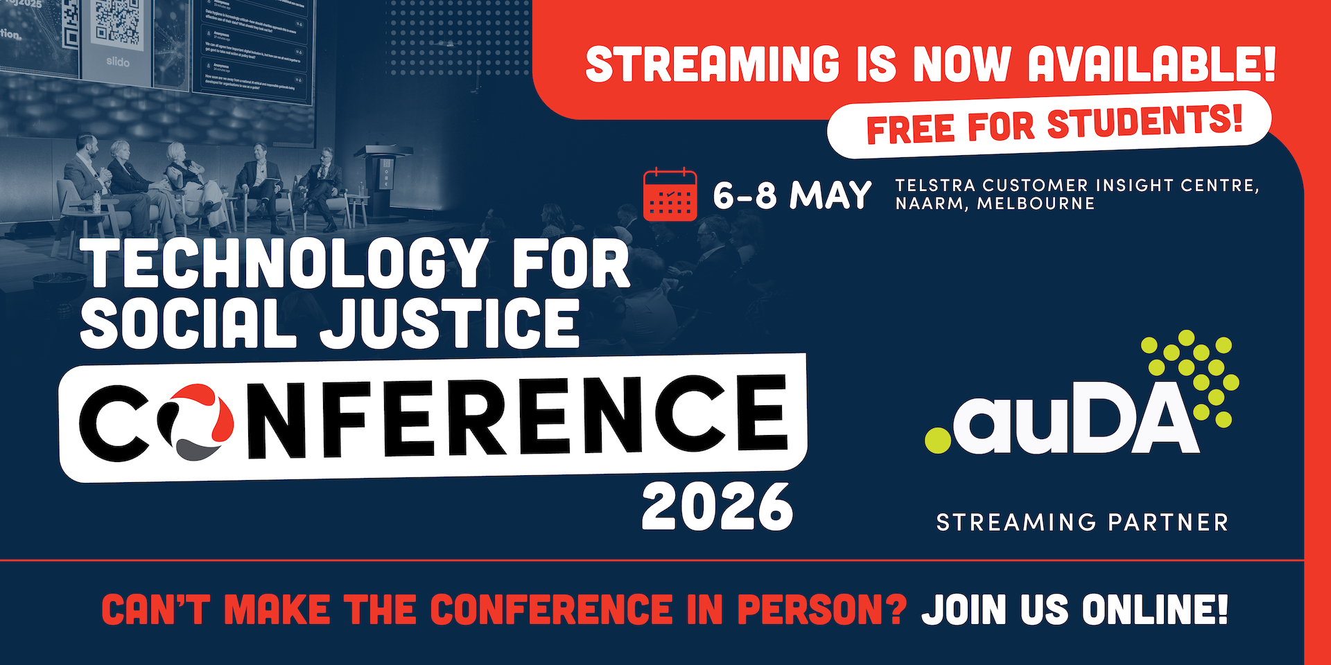 Streaming is available as part of our commitment to making the conference more accessible to future leaders and people across Australia who may not otherwise be able to attend in-person. Thank you to our streaming partner: auDA